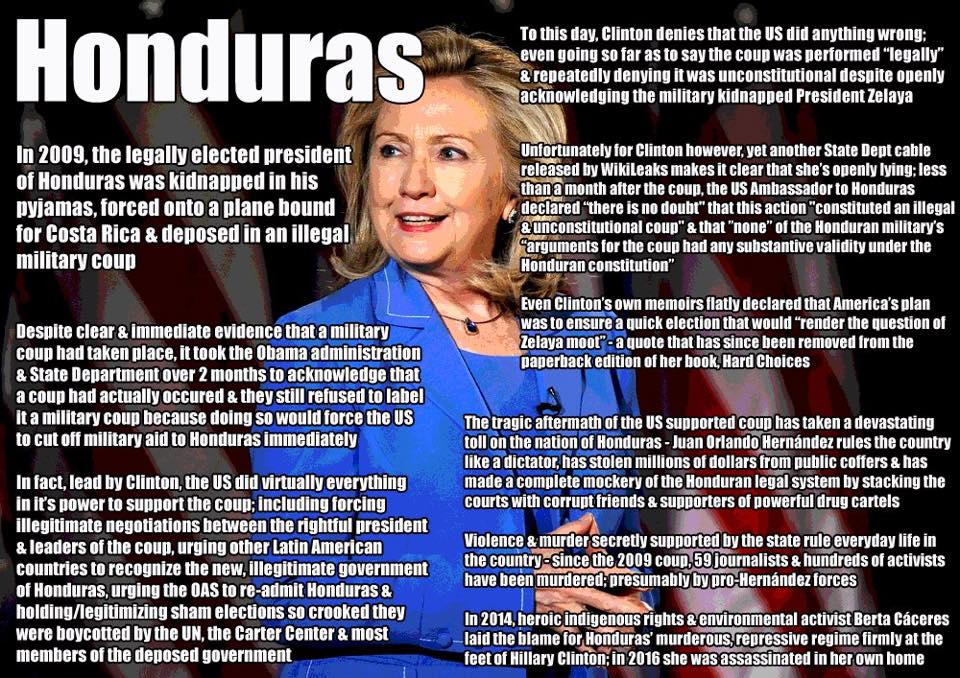 was shot dead in her home. What does this have to do with Hillary Clinton? In 2009, as Secretary of State, Clinton shepherded in the new, hard-right, School-of-the-Americas trained military junta who ousted a democratically-elected president, Manuel Zelaya. "Ousted" is not quite the right word: after a contentious back-and-forth between Zelaya and the (far) more rightwing factions of the government, soldiers broke into the president's house, beat him up, held him at gunpoint, and dragged him onto a plane--still in his pajamas--and flew him out of the country.